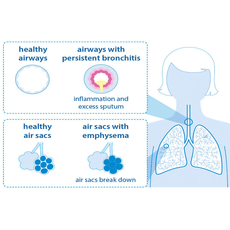 Two of these lung conditions are persistent bronchitis and emphysema, which can also occur together.
